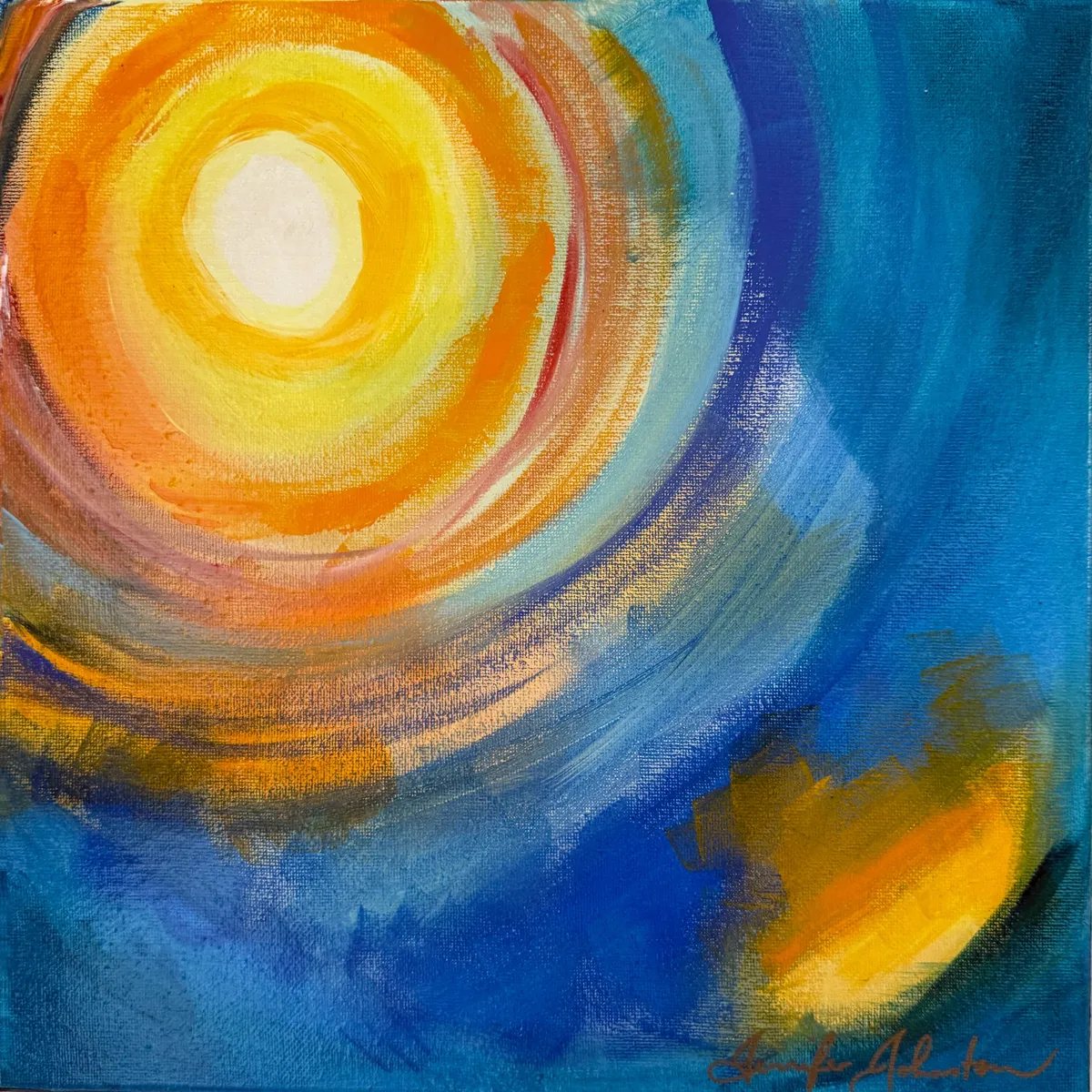 Sunshine-Inspired Abstract Canvas Art for Bright Spaces This vibrant abstract artwork radiates warmth and energy, featuring swirling hues of yellow, orange, and blue that evoke the feeling of a sunlit sky. The dynamic brushwork creates a sense of movement, drawing the viewer into a world of color and light. Each layer of paint contributes to a lively composition that embodies the essence of sunshine, making it a striking addition to any space. Perfect for brightening up a room, this piece invites a sense of joy and positivity into your environment.